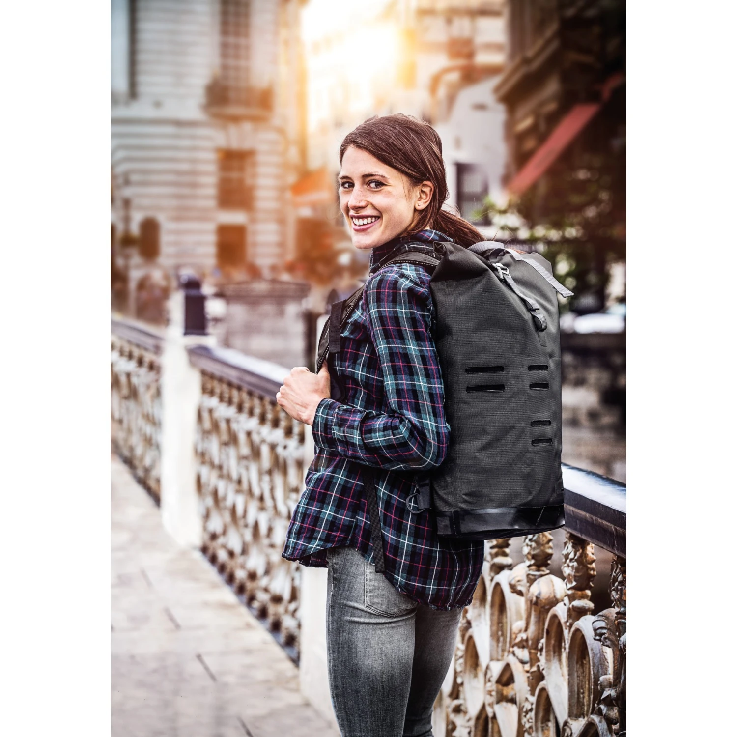 The ORTLIEB Commuter Daypack City is a waterproof city backpack made of lightweight, durable nylon fabric. With its roll closure, large main compartment and padded notebook compartment (up to 15.4), it’s a safe place for your documents and technical devices in any weather – and a pleasant companion for you thanks to its tremendous carrying comfort.