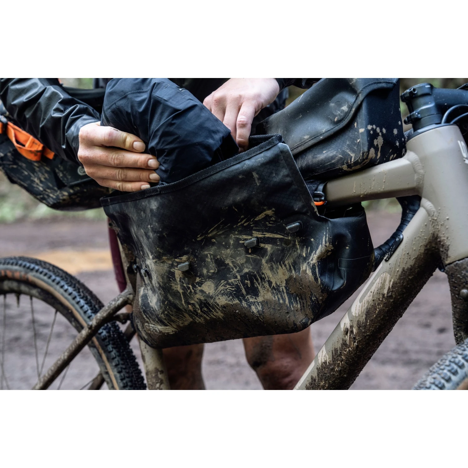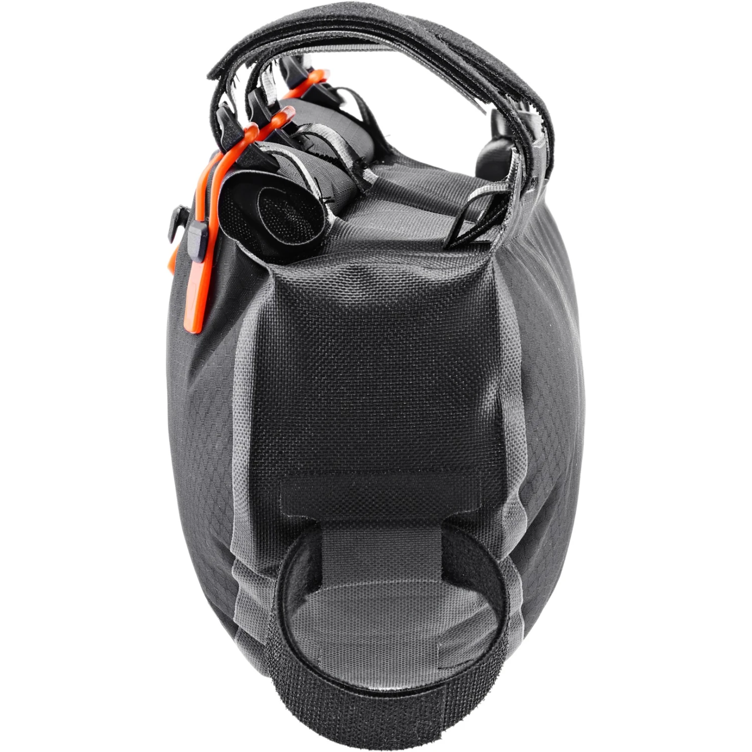 Likewise, the waterproof frame bag with roll closure is ideal for all full-suspension MTB’s whose shocks limit the space in the frame triangle. Due to the waterproof roll closure, which is secured with silicone rings, the bag from the Bikepacking series reaches the IP64 standard and thus protects the equipment from an involuntary bath. The Frame Pack RC Toptube allows the accommodation of heavy equipment such as tools or provisions within the frame triangle and thus helps to achieve a low center of gravity on the bike. The variably positionable, stable and strong Hook-and-Loop fasteners allow easy and uncomplicated mounting on the top tube and seat tube of the bike.