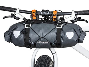 The ORTLIEB Handlebar-Pack is the waterproof luggage roll for sleeping bag and sleeping pad. It also ensures a balanced luggage and load distribution on the bike. Thanks to the roll closures on both sides, you can easily access the contents at any time. Compression straps on the outside allow you to stow and attach additional equipment. Also four hooks for attaching the Accessory Pack as a volume expansion are already present. The mounting system, consisting of spacers and two webbing straps with strong adhesive Velcro fasteners underneath, ensures a stable attachment to any type of handlebar, even the attachment to carbon handlebars is possible. A plastic stiffener inside the handlebar pack and a fixation on the head tube give reliable stability – in any terrain. Thanks to additional drawstrings, the bag offers the possibility to accommodate further equipment.