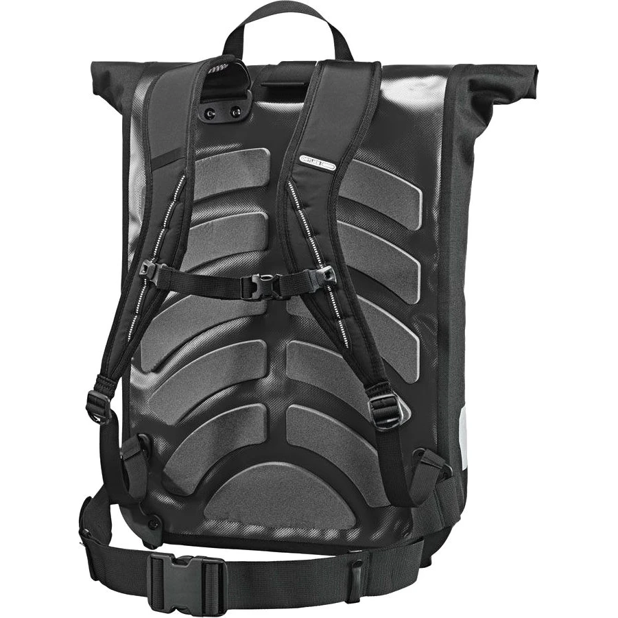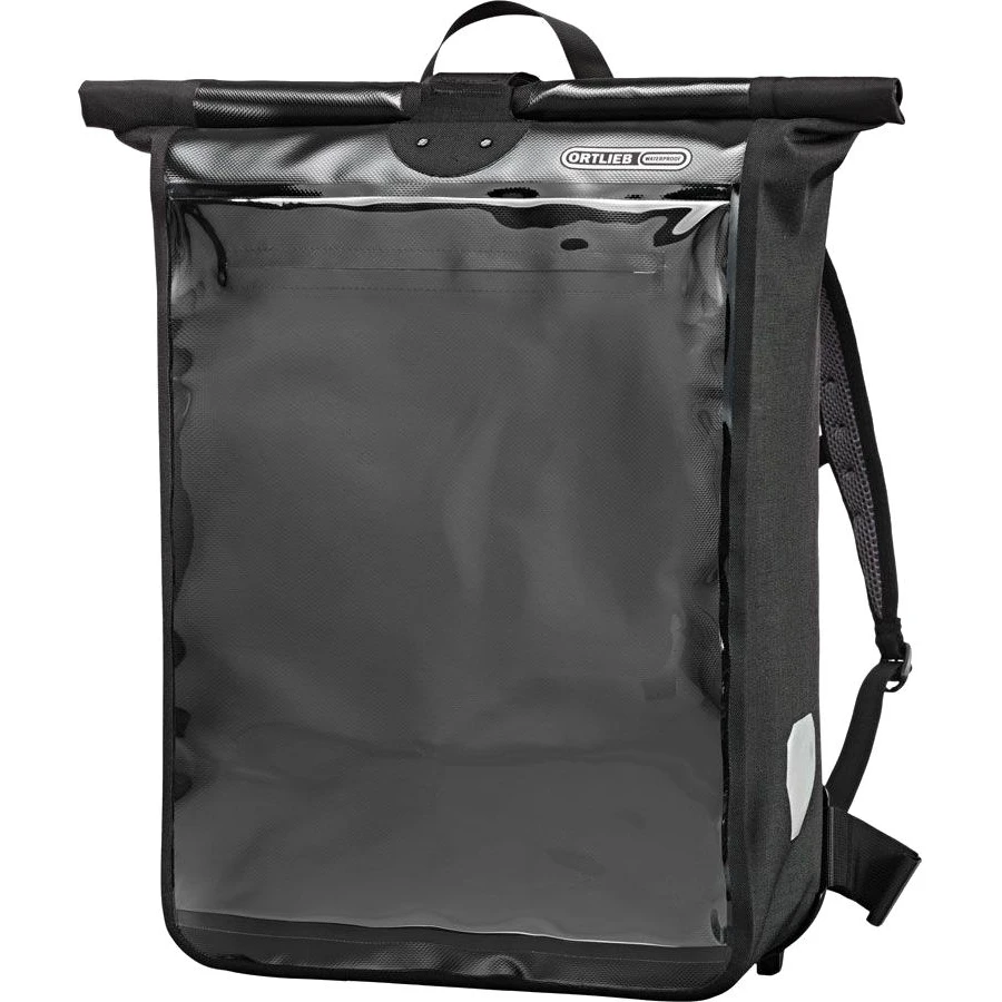 Professional high-end messenger bag with transparent insertion compartment for advertising posters in A3 format for secondary use as mobile advertising space. Simply smart: With the Messenger-Bag Pro, the courier who crisscrosses the city becomes a mobile advertising space for customers and additional advertising revenue or in his own cause. The transparent, waterproof pocket on the back is large enough for A3-format posters that stand out in the street. The interior has also been planned with many years of ORTLIEB insider know-how: The knotted-out inner pocket with zipper for ride checks, smartphone, city map, pens, etc. can also be worn as a hip bag. The organizer compartment keeps freight papers and driver’s checks organized. The roll-top closure with extra-long hook-and-loop closure allows for quick access as well as transport of bulky items. The foam padded back with good ventilation as well as hip belt provides excellent comfort and the contoured straps with reflective stripes provide more visibility and safety in traffic.