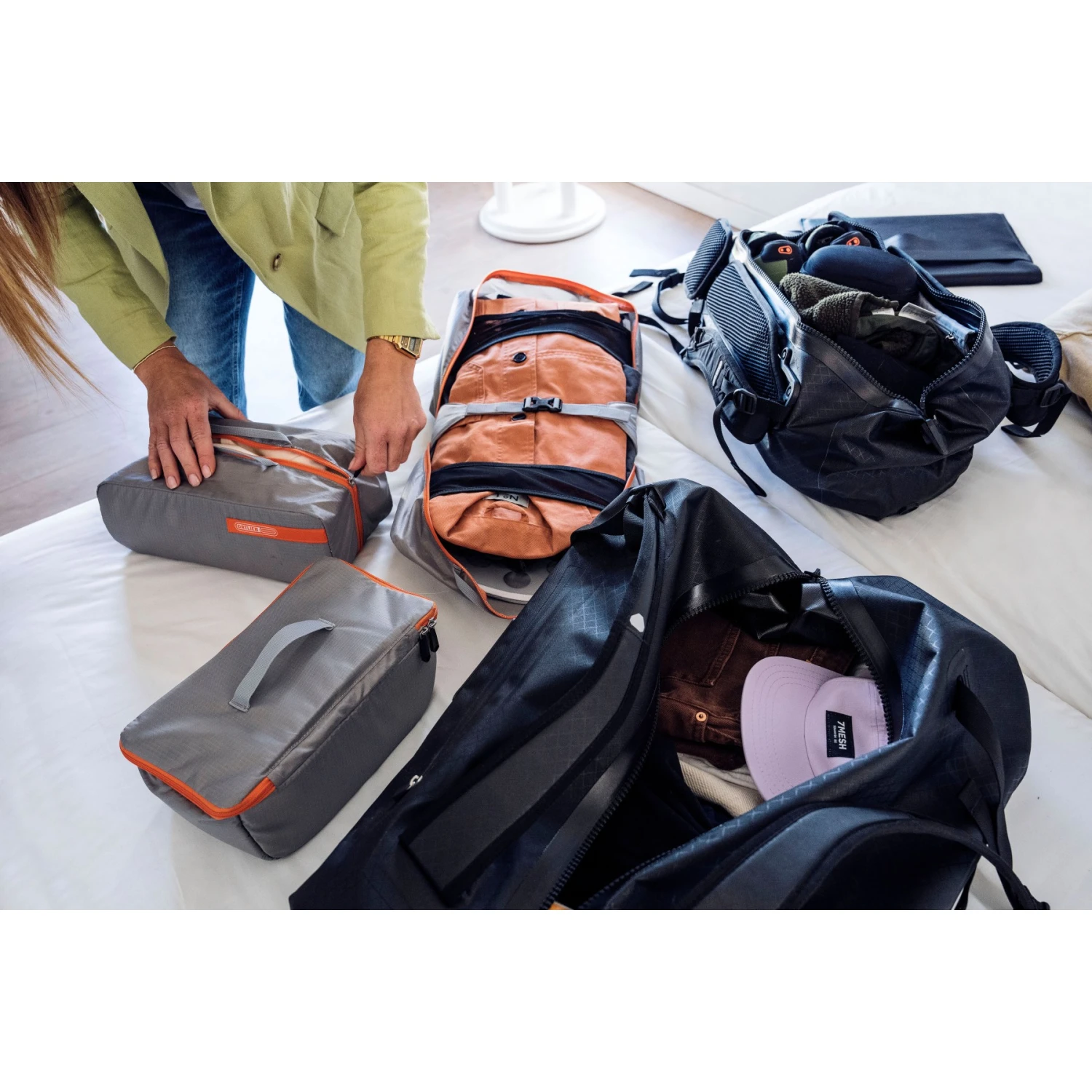 - In a bike bag (eg Back-Roller, Bike-Packer) does not fit a complete bundle, but either 1x Packing Cube L and 1x Toiletry Bag or 2x Packing Cube S and 1x Toiletry Bag.